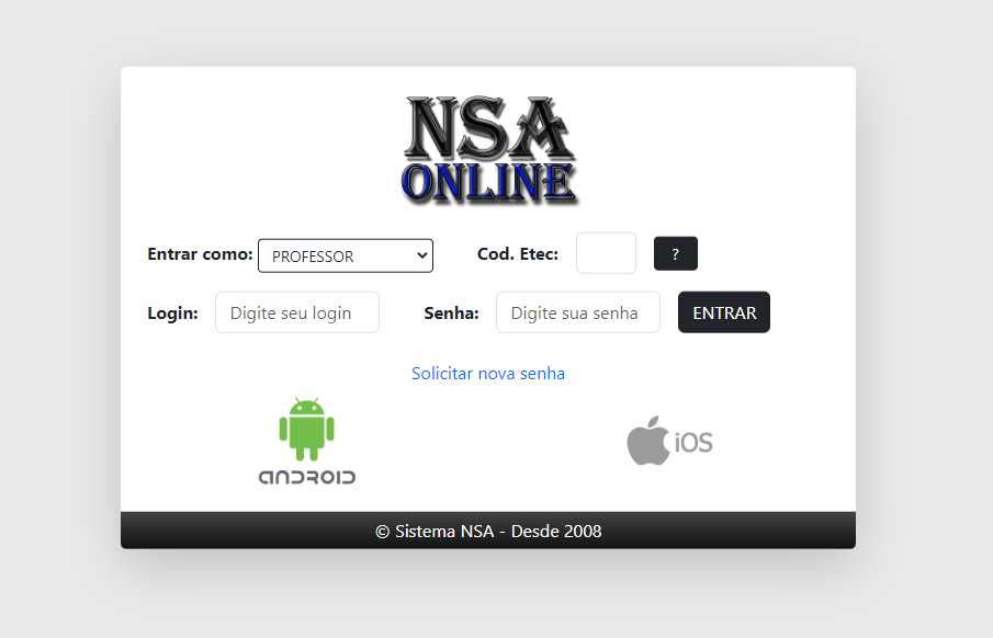 Para acessar o NSA como professor pelo navegador, pesquise “NSA Online” ou acesse o link acima. Na página do NSA Online, também é possível encontrar links para o download da versão em aplicativo do NSA (recomendamos usar a versão de navegador, pela quantidade de funções disponíveis).