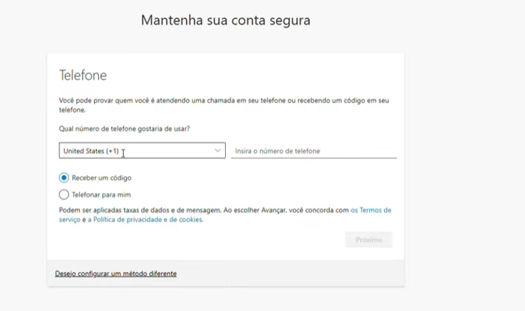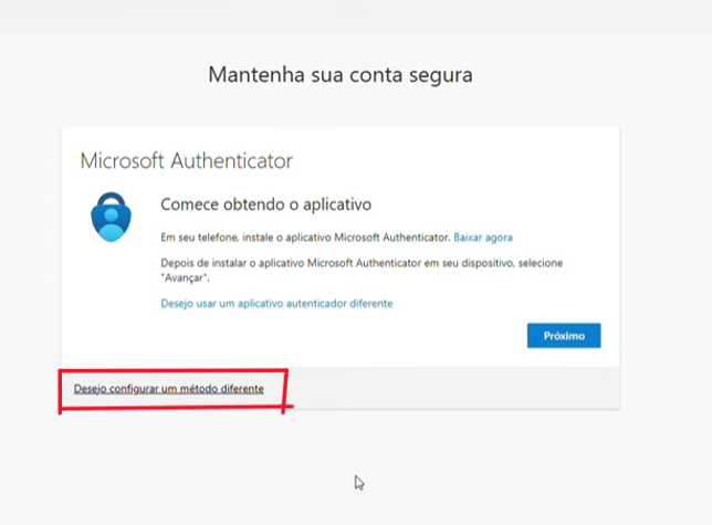 Se desejar configurar o aplicativo Authenticator, basta seguir as orientações dadas pela plataforma. Senão, clique em “Desejo configurar um método diferente”.