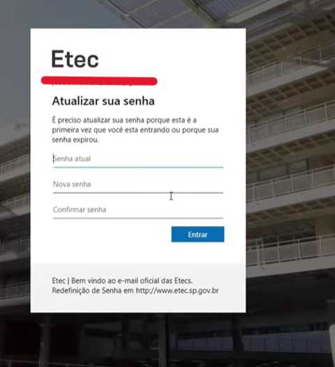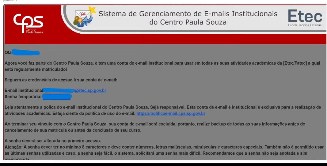 Quando o estudante adentra a Etec, recebe, no e-mail pessoal informado no ato da matrícula, um endereço de e-mail institucional – —–@etec.sp.gov.br – e uma senha temporária.