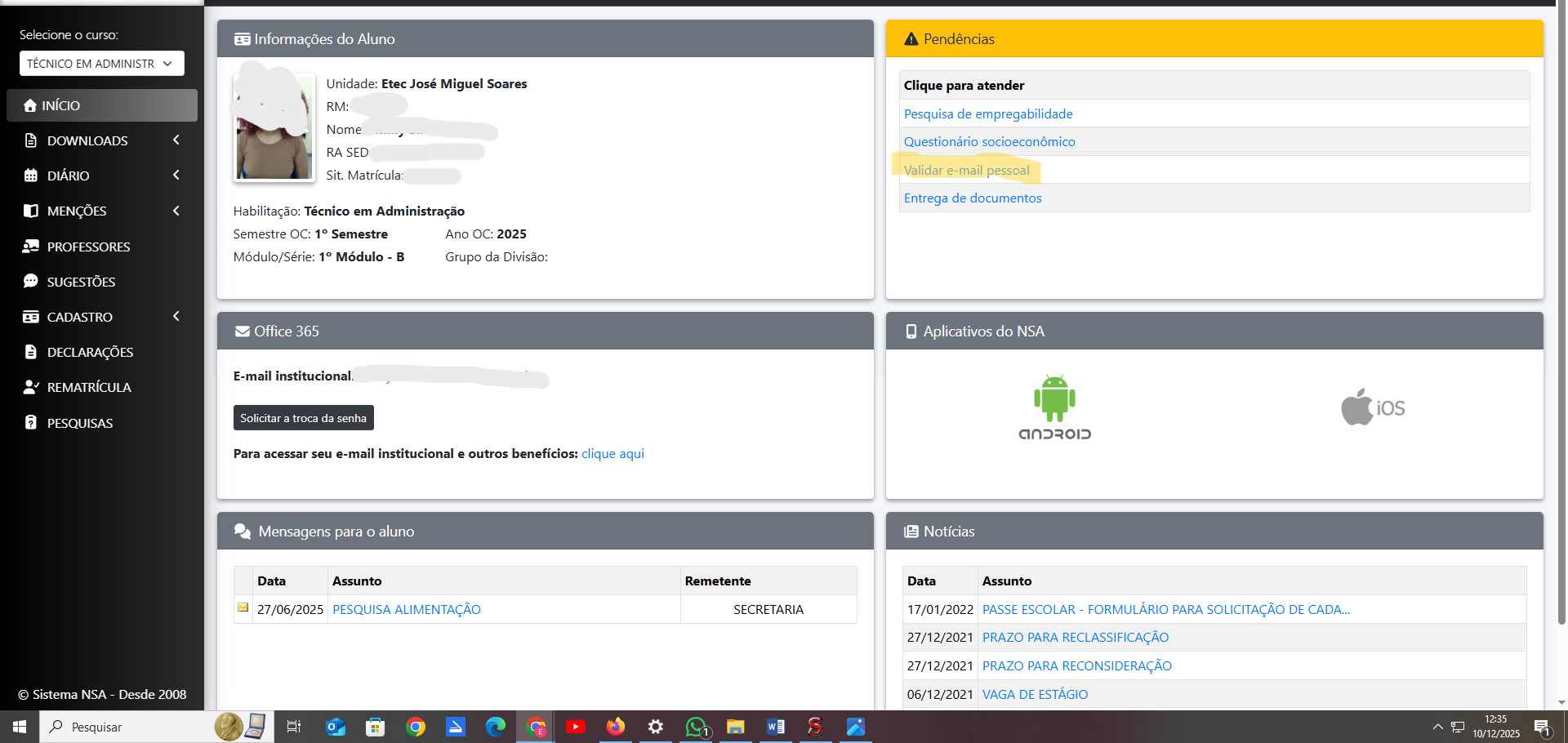 Neste caso, a validação de seu e-mail será considerada uma “pendência” sua enquanto aluno. Veja, no próprio ambiente do NSA, que há uma opção, na primeira página da plataforma, que reenvia a validação do e-mail pessoal.
