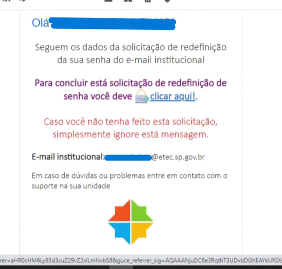 Também na plataforma do NSA, há a opção de reset de senha, abaixo do seu e-mail institucional. Clique nesta opção e, em até 24 horas (a depender do servidor da própria Microsoft, o que envolve a quantidade de pedidos de reset feitos simultaneamente), você receberá uma senha em seu e-mail pessoal.